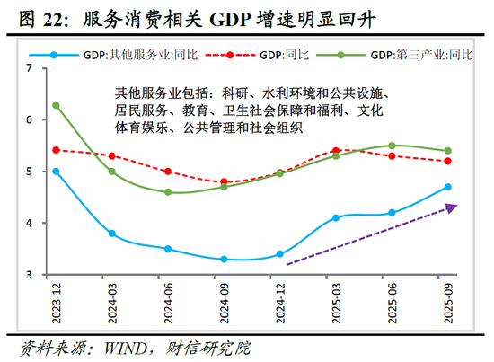 二是宏观政策系统性转向更重消费,服务消费有望成为关键增长点。首先,结构性差距决定服务消费将成为政策发力的关键瞄点。当前我国居民消费率仅约40%,低于处于同等发展阶段的日本、韩国、德国、英国、美国约18个百分点,其中近七成的差距体现在服务消费(见图21)。为加快形成内需主导的增长模式,宏观政策重心势必长期、系统地向提振服务消费倾斜。其次,财政与货币政策正协同形成支撑合力。财政方面,2025年加大民生投入已初见成效,教育、医疗、文体娱乐等服务业GDP增速明显改善(见图22);2026年随着“提高民生类政府投资比重”等部署落实,其支持力度有望进一步增强。货币方面,央行近期已明确引导金融机构加强对服务消费的信贷投放,参考“十四五”期间定向支持绿色、科技领域的经验,预计“十五五”期间信贷资源将加快向服务消费领域集聚(见图23)。上述措施将推动相关服务业延续高景气度,进而从增加优质有效供给和创造就业两方面,支撑服务消费增长。此外,休假制度改革将释放潜在需求。服务消费对连续闲暇时间有刚性需求,“十五五”规划明确要求落实带薪错峰休假,近期多地试点中小学春秋假,将从制度层面为服务消费提供有力支撑。