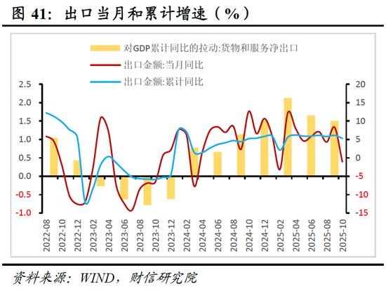 2025年1-10月,我国出口额累计增长5.3%,增速与2024年全年持平。尽管面临美国持续高关税冲击,但展现出了较强韧性(见图41),对GDP形成重要支撑。出口强韧性原因有三:一是出口数量增长和价格因素拖累的减弱(见图42);二是出口目的地的多元化,尽管对美出口大幅下降,但对东盟、非洲及欧盟等非美经济体的出口有效弥补了这一缺口(见图43);三是我国新动能和高附加值产品竞争力增强(见图44),产业竞争力提升带动出口需求上行。