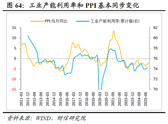 三是反内卷政策将继续对国内定价商品价格形成温和支撑。中央经济工作会议明确将深入整治“内卷式”竞争作为破解经济“供强需弱”矛盾的关键路径,预计随着相关规则制度进一步落地,相关行业价格温和回升将是确定性方向。但本轮价格上涨幅度预计低于2015‑2016年供给侧改革时期,主要受以下两方面制约:其一,当前政策效果呈现结构性分化。2025年7月份反内卷政策落地以来,PPI环比回升主要集中在煤炭、钢铁等上游行业,而中下游制造业及房地产相关行业价格尚未止跌(见图63),工业产能利用率也持续处于低位,反映出整体产能去化仍需时间(见图64)。其二,价格由上游向中下游传导面临明显约束。本轮反内卷更侧重市场化、法治化手段,且中下游行业以民营企业为主,产能调整节奏可能相对平缓。同时房地产市场仍处于调整阶段,内需复苏力度大概率温和,需求侧难以对价格回升形成明显拉动。综上,对2026年PPI增速回升保持审慎乐观。假设2025年11月至2026年12月PPI环比均值分别为0%及供给侧改革时期约四分之一的水平(从止跌首月起算相同时长),估算结果显示,2026年PPI同比分别增长-0.5%和0.0%,分别于7月和6月转正(见图65)。