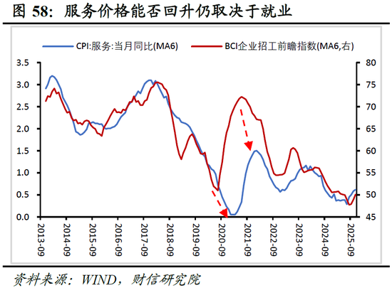 预计2026年服务业价格有望受到政策支撑。近年来受房地产市场深度调整影响, CPI居住服务价格同比增速长期徘徊在0附近,预计2026年亦难以显著改善(见图57)。服务价格能否回升,将取决于旅游、医疗、教育等非居住类服务的价格弹性。政策层面有望提供重要支撑:一方面,随着“以旧换新”政策对商品消费的拉动效应减弱,2026年补贴范围有望扩展至服务领域,形成直接刺激;另一方面,扩大服务消费是“十五五”时期实现提升居民消费率目标的核心抓手,预计文旅、养老、医疗等领域将成为政策发力重点。当前鼓励中小学生放春秋假、落实带薪休假等举措,正是为了创造消费场景、释放服务消费潜力的先行尝试。但服务价格回升幅度预计有限。其一,居民“就业-收入-消费”循环仍面临压力。服务价格能否持续回升,根本上取决于该循环的改善程度。目前BCI企业招工前瞻指数仍处于历史低位区间,预示着2026年就业市场依然承压(见图58),将从基础上制约消费能力释放与服务价格上涨空间。其二,服务消费补贴政策效果可能受限。尽管政策方向明确,但服务补贴在实际执行中面临消费场景复杂、监管成本高等挑战,政策传导效率可能弱于商品补贴,对价格的提振作用可能较为有限。