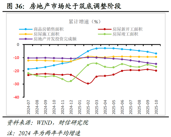 2025年的房地产市场,整体仍处于自2021年年中深度调整后的筑底阶段,呈三大特点:一是供需两侧均呈深度调整。地产销售在2025年一季度小幅回升后,二季度再度回落,需求端销售面积增速降幅扩大,1-10月商品房销售面积累计下降6.8%,连续7个月降幅扩大。同时,供给端的新开工面积、施工面积、竣工面积、开发投资累计增速分别为-19.8%、-9.4%、-16.9%、-14.7%,降幅较大,供给指标未见明显起色(见图36)。二是房地产价格尚未止跌。与最高点相比,70个大中城市新房、二手房价格调整幅度分别为10.8%、18.9%(见图37),降幅仍在扩大,且二手房调整幅度明显高于新房。分城市看,一、二线城市新房价格跌幅持续小于三线城市,尽管今年一季度曾短暂企稳,但二季度以来重回跌势,市场持续回暖乏力(见图38)。三是去库存压力较大。从待售商品房去库存压力看,10月存销比为9.1倍(见图39),仍处于有数据记录以来的高位水平,去库存仍是未来主要任务。